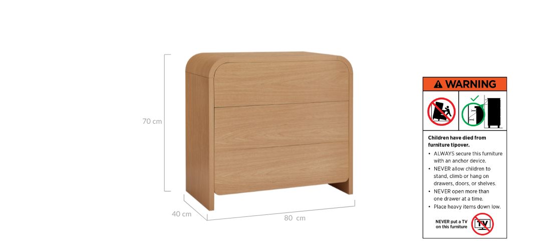 Your safety is our utmost priority. To prevent accidents, we strongly recommend securely anchoring your furniture using the provided wall straps. Detailed step-by-step guidance can be found in your assembly instructions. For further information on compliance and best practices, please review: Consumer Goods (Toppling Furniture) Information Standard 2024 and Toppling furniture mandatory information standard – supplier guide | ACCC Product Safety
