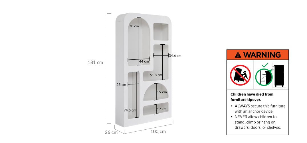 Your safety is our utmost priority. To prevent accidents, we strongly recommend securely anchoring your furniture using the provided wall straps. Detailed step-by-step guidance can be found in your assembly instructions. For further information on compliance and best practices, please review: Consumer Goods (Toppling Furniture) Information Standard 2024 and Toppling furniture mandatory information standard – supplier guide | ACCC Product Safety